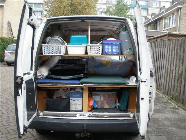 Zo heeft dit beest ons 421.500 km. gediend zonder noemenswaardige problemen en werd het toch tijd om iets anders te bedenken. Een APK keuring bracht 1700,= Neuroses reparaties aan het licht en dat vonden we wel wat veel. Een nieuwe zat er even niet in dus kozen we voor een tussenoplossing. Dat werd een Renault Kangoo waar de elektrische scooter precies in paste en die ik ook voorzag van wat zwerfbuselementen zoals op de foto`s te zien is. Helaas ontstond er een duur elektronisch probleem waardoor de auto op allerlei ongelegen momenten niet meer wilde starten. Prima karretje maar helaas moesten we op zoek naar iets anders.