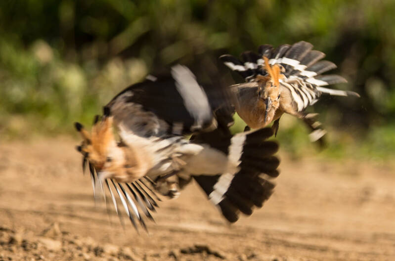 Vanaf de eerste dag viel mij het grote aantal vogels op, óók in het aantal soorten. Als niet zelf benoemd “vogelaar” heb ik de meeste wel voor de lens gehad, op één na. De Wielewaal of Oriolus oriolus. Heel schuw en een meester in het zich verbergen in het dichte gebladerte. Slechts een geel-zwarte glimp in het groen of flits in de lucht. Net als de Hop of Upupa epos verraadt hij zijn aanwezigheid met zijn roep. Mogelijk dat een foto in de toekomst nog eens gaat lukken. Onderweg in de omgeving werd ik op een onverharde weg verrast door een stelletje woest vechtende Hoppen. Snel stoppen en schieten met de camera die altijd naast mij ligt. De instellingen niet optimaal maar toch lukte het ze vast te leggen. Het werd ook bloederig.