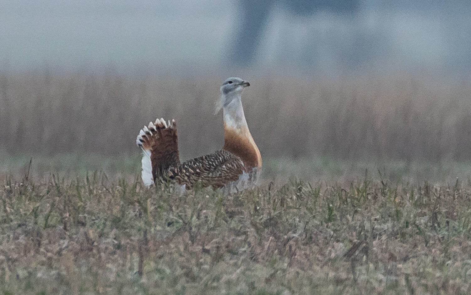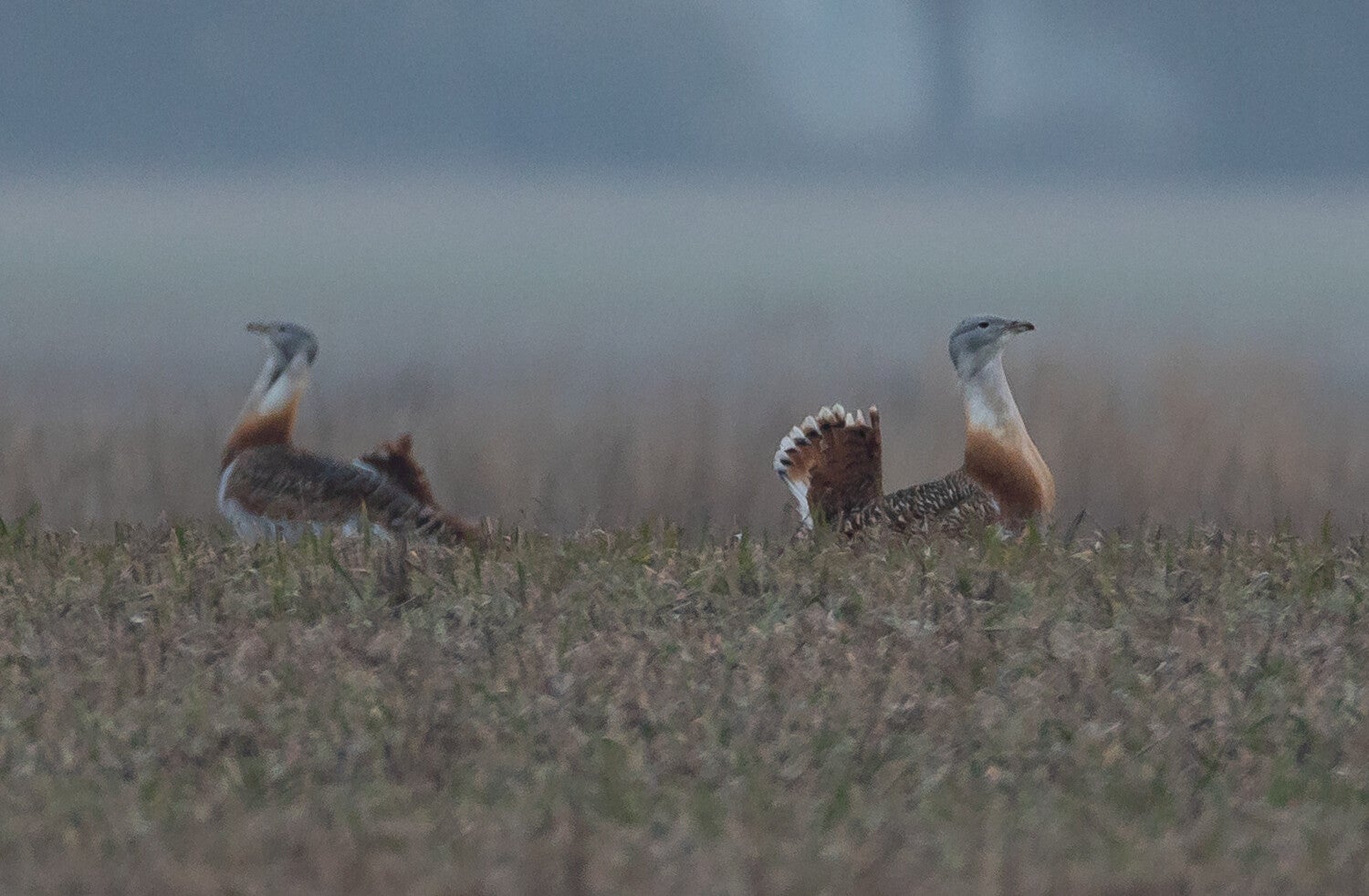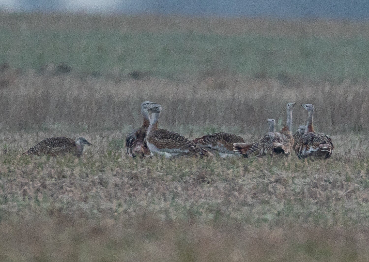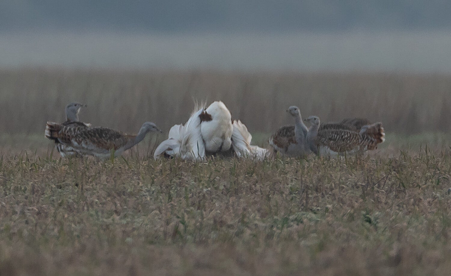 Maar dan, bij Garlitz, zie ik links in een veld iets bewegen. Het is weliswaar redelijk ver weg, maar de Grote Trappen zijn de klos. Ik maak een ruime serie van zo`n 30 á 40 vogels waarvan de 5 mannen soms gaan baltsen of walsen voor de plm. 30 meiden. Wát een lustoord voor de heren J. Het is pas zeven uur en het is bewolkt dus de ISO moet wat hoog, hetgeen meer ruis op zal leveren. De plaatjes blijken later in de middag redelijk gelukt volgens Lightroom.