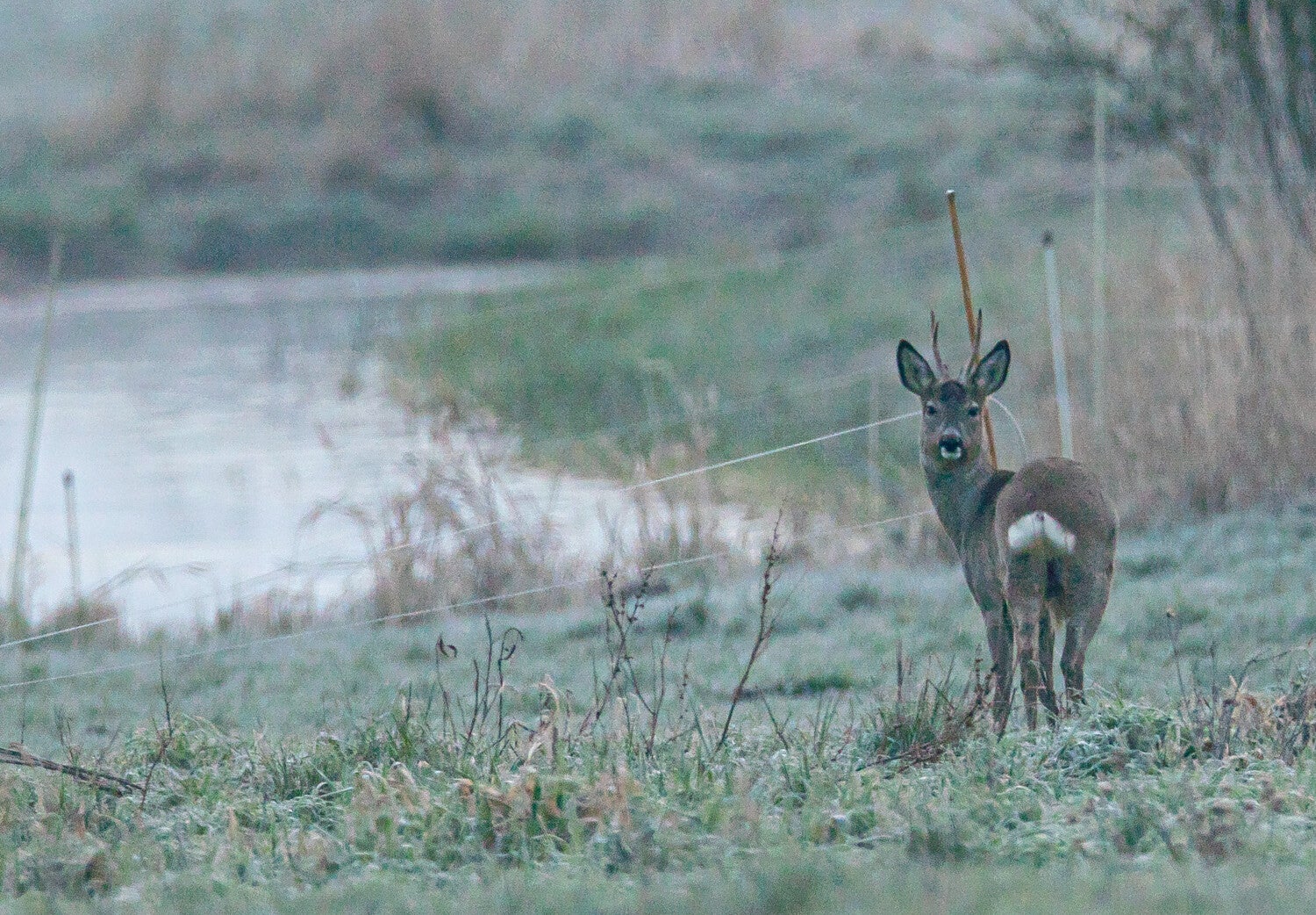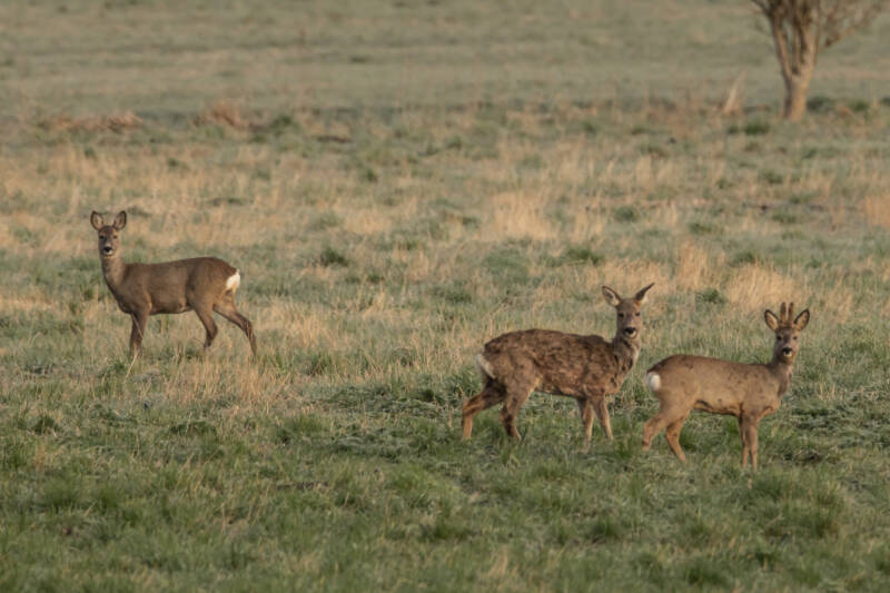 Zo dobber ik naar donderdag 6 april als ik `s morgens om 05.40 vertrek naar Het Havelland om de Grote Trap te betrappen. Althans dat is de bedoeling. Na zo`n 180 km. even een bakkie. Na 320 km. even een hap en wat lossen. Onderweg komen Bellerophon en ik nog langs de Badderende Mannen oftewel Bathmen. Pas in Duitsland zie ik de eerste reeën en het zouden er heel veel worden, ondanks al die wolven (?).