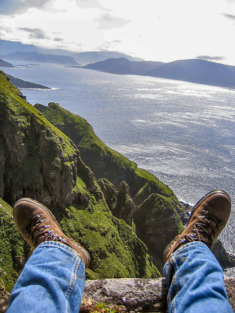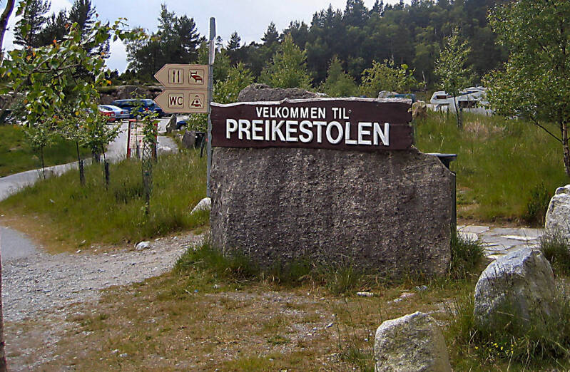 Zo wordt deze lange en intensieve reis dan min of meer afgemaakt op het letterlijk het laatste hoogtepunt, de Preikestolen. In dit jaar nog een ruwe klim over rotsblokken. Nergens een trap want die komen later pas. Rustig klimmend ben je toch al gauw 2,5 uur kwijt en soms best even achter adem. Maar eenmaal boven is er de victorie op dat mooie plateau waar je uitkijkt over de Lysefjord. Dan ook nog even op de rand kijken of je misschien hoogtevrees hebt. Het is maar 605 meter!! Zelf doe ik dat en het is best even billenknijpend moet ik zeggen, maar het feit is gepleegd. De meeste mensen gaan op hun buik liggen om over de rand te kijken, misschien wel zo wijs :-).