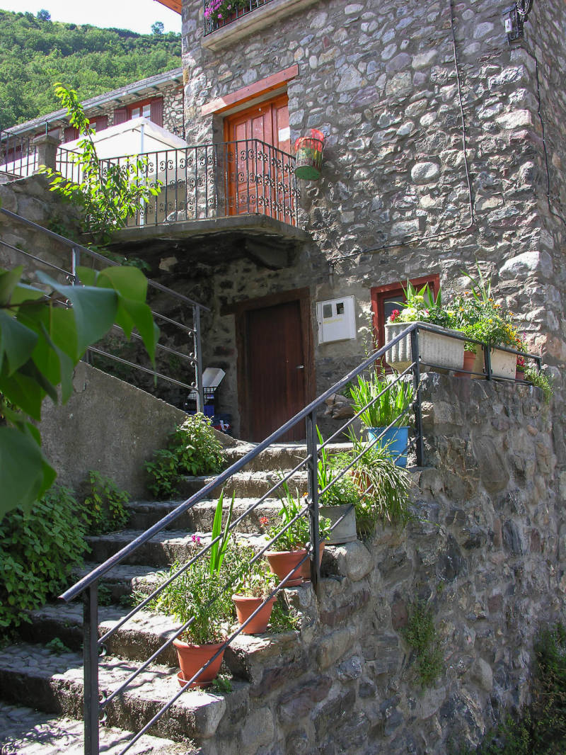 Het grootste deel van de dagroute zou mij over de N260 voeren. Als ik al enige sensatie had genoten, werd het nu echt spectaculair rijden. Het eerste deel is steil, korte bochten, korte rechte stukken, brede weg, geen verkeer dus weer helemaal genieten tot uit het dak. Wat een tegenstelling met gisteren. Het tweede deel is ook weer geweldig want de weg is hier vrij nieuw, prachtig asfalt en heel veel, hele lange bochten. De rechte stukken werden afgeraffeld met bijna 150 in het uur. Dan is er koffie en een bocadillo con jamon in La Pobla de Segur. Heerlijk in het zonnetje met een temperatuur die vandaag de dertig weer zal halen. Hierna blijk ik een foutje met MapSource te hebben gemaakt want ik kom op een zeer klein en zeer slecht weggetje terecht. Het is maar vier kilometer dus maak ik die wel af.