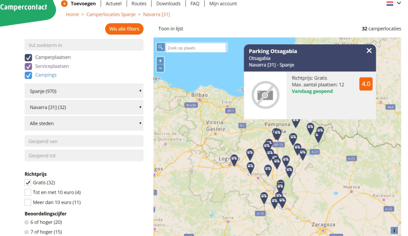 Hierboven de kaart van Campercontact met camperplaatsen in Navarra waar ik Otsagabia heb aangeklikt. Als je op die popup klikt, komen de gegevens en vaak ook foto`s van die plaats tevoorschijn. Klikt u maar even rechts>>>.